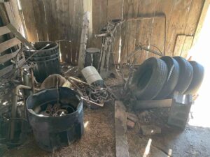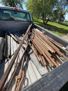 And we’re back down at the farm! The goal of this trip is to gently take down the old garage. Beck calls it the “metal shed” because that’s where I’ve staged all the clean-up metal over the past 3-4 years. We spent the morning going through what was left in the building including my metal “keepers”. Beck was smart enough not to question my selections! We cleaned out the west grain room in the corn crib and got rid of some 25 year left-over oats to make room for my keepers. We cleaned out another pickup load of junk out of the old garage to get the insides completely clean. We then had to tackle a bunch of old well pipe each about 21 feet long that has been laying outside the old garage since last summer. Since 21 feet doesn’t go into an 8 foot truck bed, we had to make two cuts in each pipe to get it to fit in the back of the truck. I lost count of how many cuts I made before I burned out my $35 angle grinder. You know when you see smoke, you’re done grinding!
