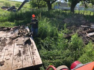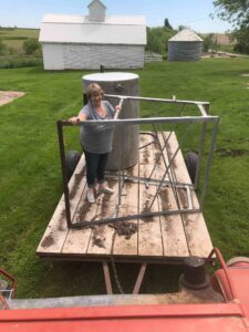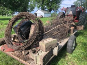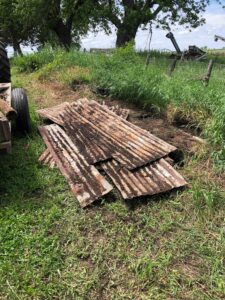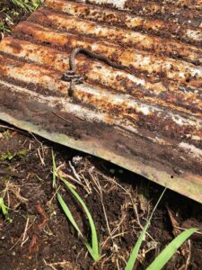 Day 3 on the farm. Since we’ve been doing this, we’ve discovered on the third day, we’re pretty tired. We got a final trailer load from Dad’s junk pile. Carol stopped out and helped us move the gas barrel out. We started on the last outside clean-up area north of the machine shed. It didn’t go well because Beck came around the corner and announced in a fairly loud voice she saw something slither away in the grass. She decided not to work there, so she did a great job cleaning up with the hand mower. I started on the pile and immediately saw about an 18” brown snake. Since I was prepared, not a big deal. Started pulling galvanized sheeting up and ran into one of her offspring. Picture below. Tomorrow is Sunday and we’re taking it off. Back at it on Monday!